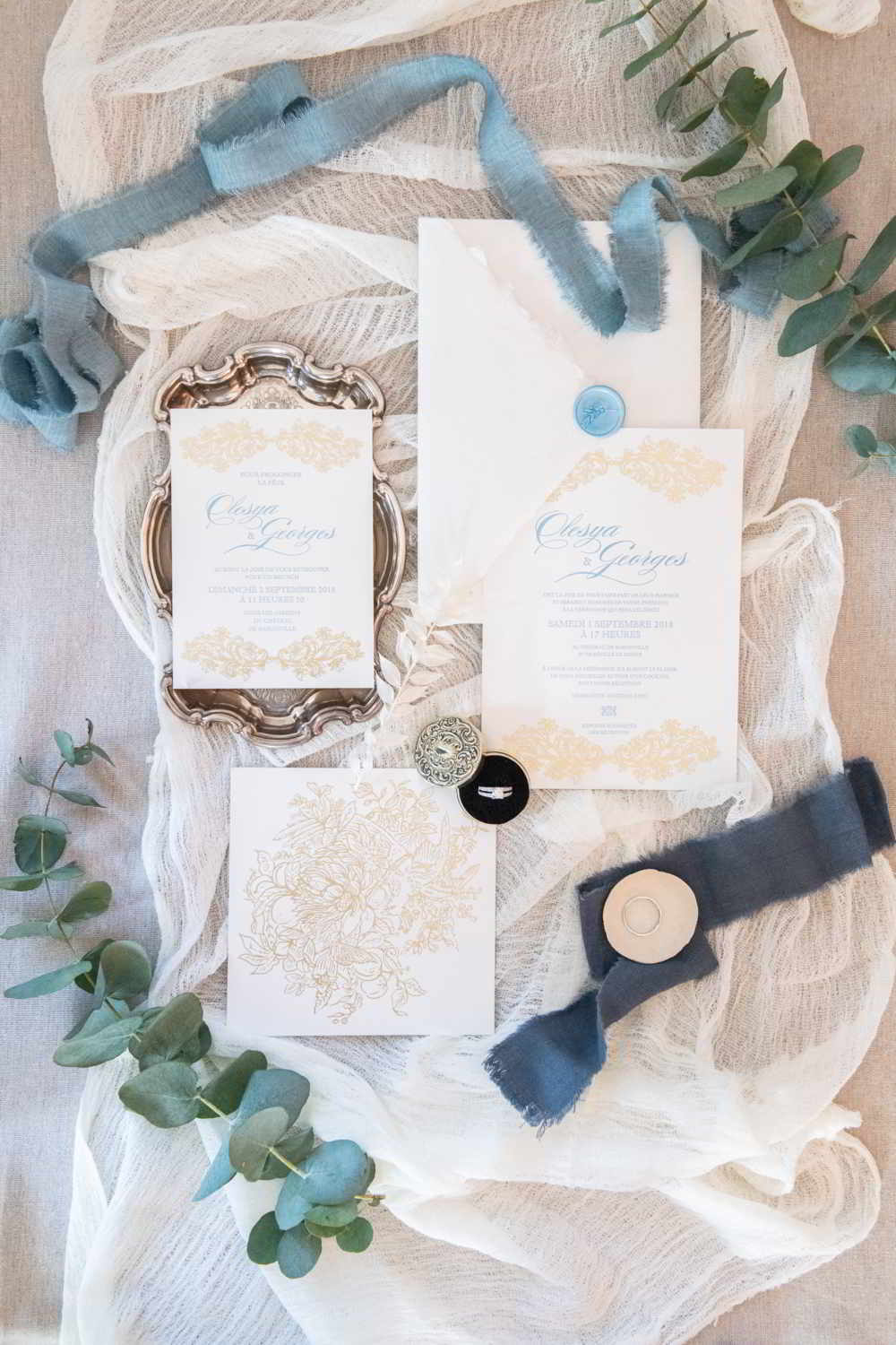 Une très belle inspiration mariage au Château de Castellet en Provence de style fine art : Un flatlay de bijoux, de carterie et parfum, une élégante décoration de table et un wedding cake.